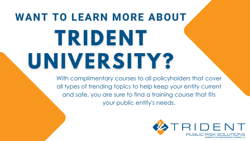 Trident University is our exclusive online knowledge base for our public entities filled with 1,393 (and growing!) courses for you and your employees. Our courses are complimentary to all policyholders and cover all types of trending topics to help keep your entity current and safe. From HR issues like sexual harassment to wrongful terminations, law enforcement topics from de-escalation to safety training, and auto fleet courses like distracted driving and preventive maintenance. You will surely find a training course that fits your public entity’s needs.